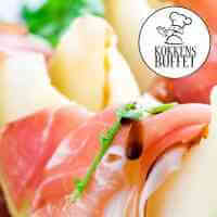 - Kokkens honningmelon svøbt med lufttørret skinke pyntet med cherrytomater. Anrettet portionsvis på fad. 1 stk. pr. pers. á kr. 15,- pr. kuv. , +DKK15,00