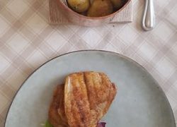 - Stegt unghanebryst med rattatouille timbale med mild gedeost og polenta, hertil rucola salat og sauce provencale.